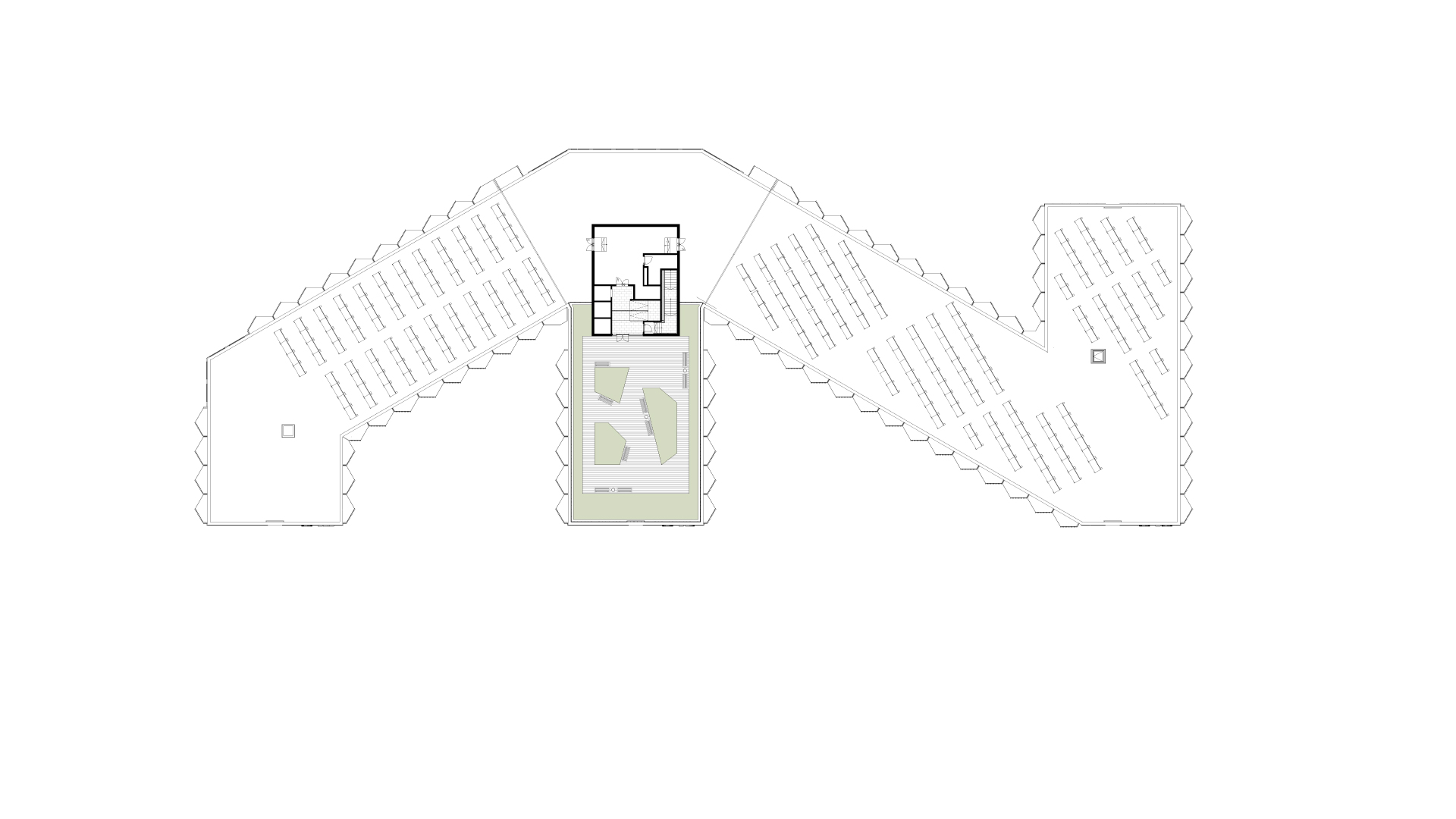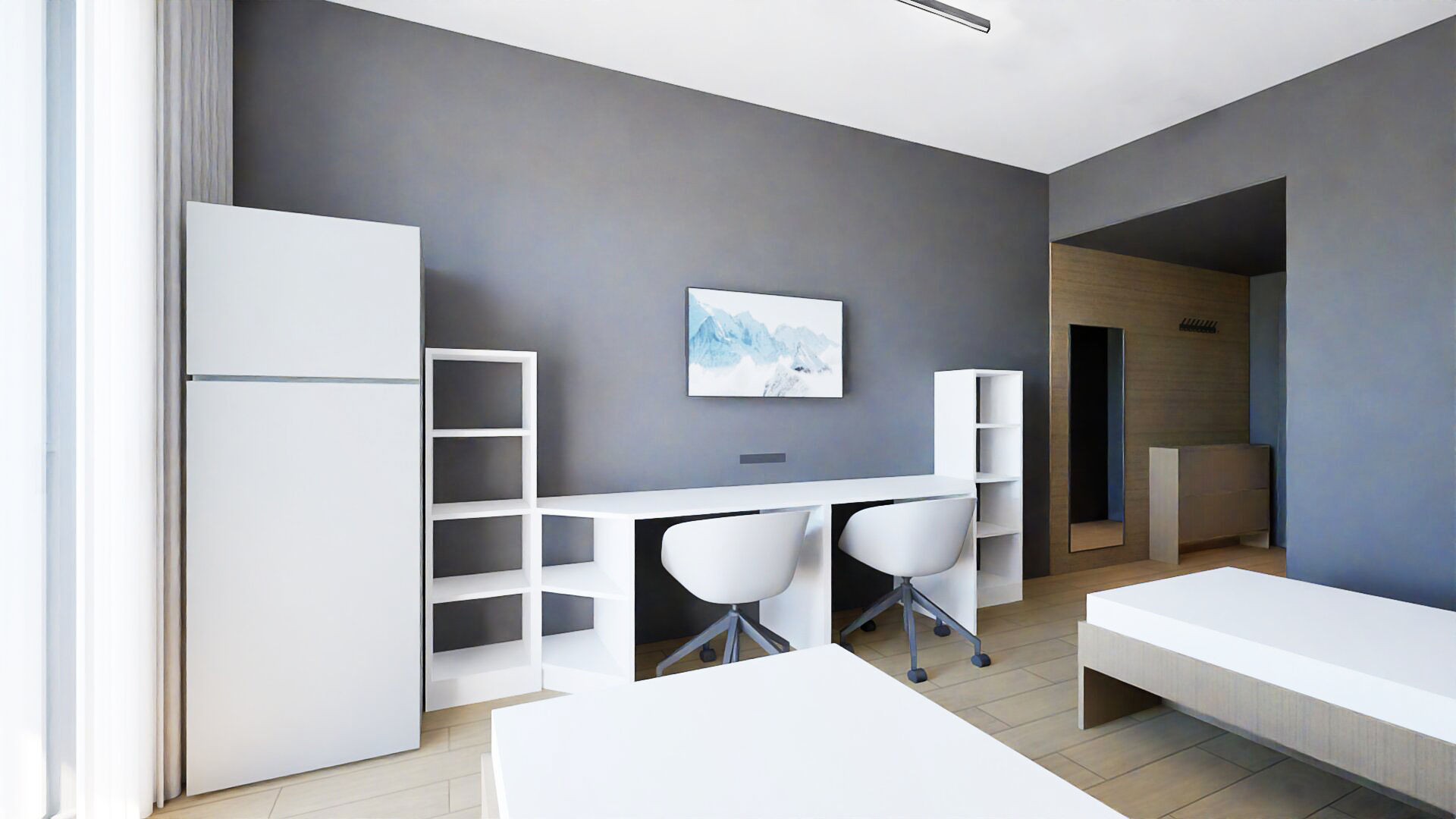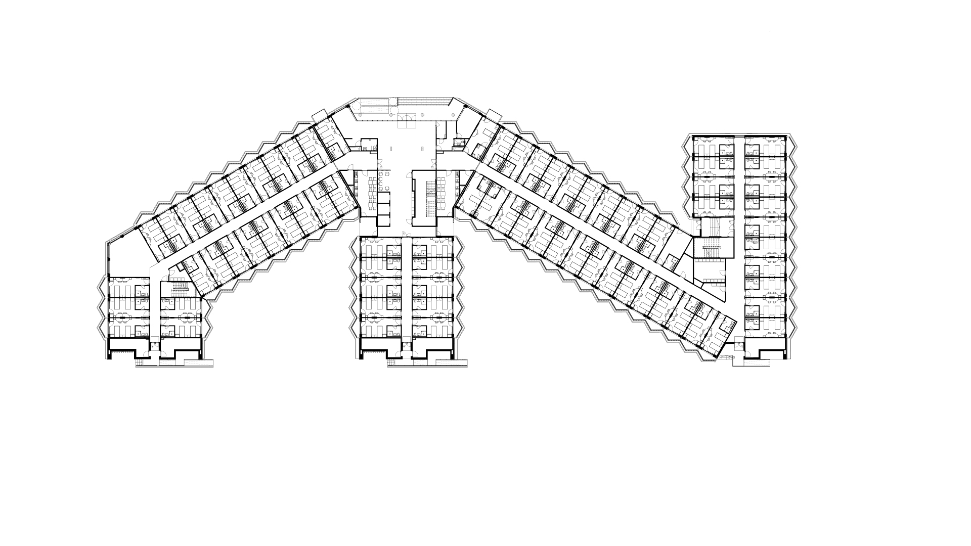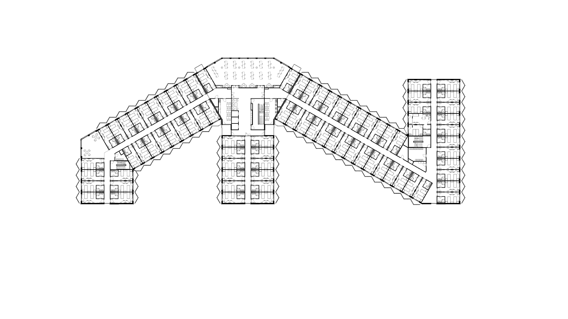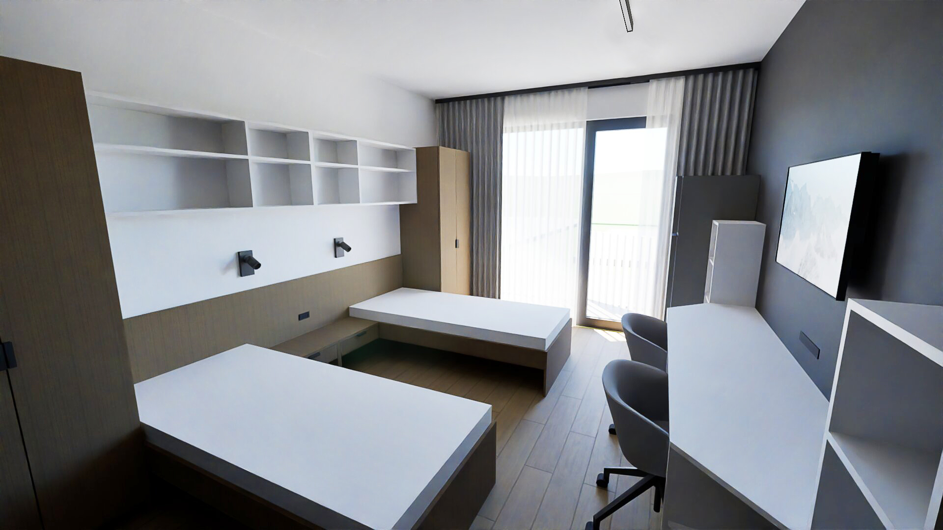 Spectaculosul campus al Universității din Oradea își mai adaugă un strat prin realizarea unui cămin studențesc de ultimă generație. Preluând liniile construcțiilor anterioare din zona vestică a ansamblului, proiectul intră în dialog atât cu ceea ce s-a construit deja cât și cu cele încă doar propuse, pentru care s-au rezervat terenuri printr-un masterplan care acoperă întreaga suprafață disponibilă. Toate camerele acestui cămin au capacitatea de două locuri, cu un confort care are în vedere nevoile vieții de student. La acestea se adaugă câteva apartamente pentru familiști și camera pentru cei cu nevoi speciale. Pentru activități complementare, întreținere, prepararea și servirea mesei, studiu și relaxare, există spații speciale dedicate și amplasate pentru a fi folosite de grupuri de utilizatori din diferitele ramuri ale clădirii. Am acordat o atenție deosebită intimității și relaționării deopotrivă, oferind balcoane tuturor camerelor și grădini în buzunarele aflate pe sol, dar și pe acoperișul verde.